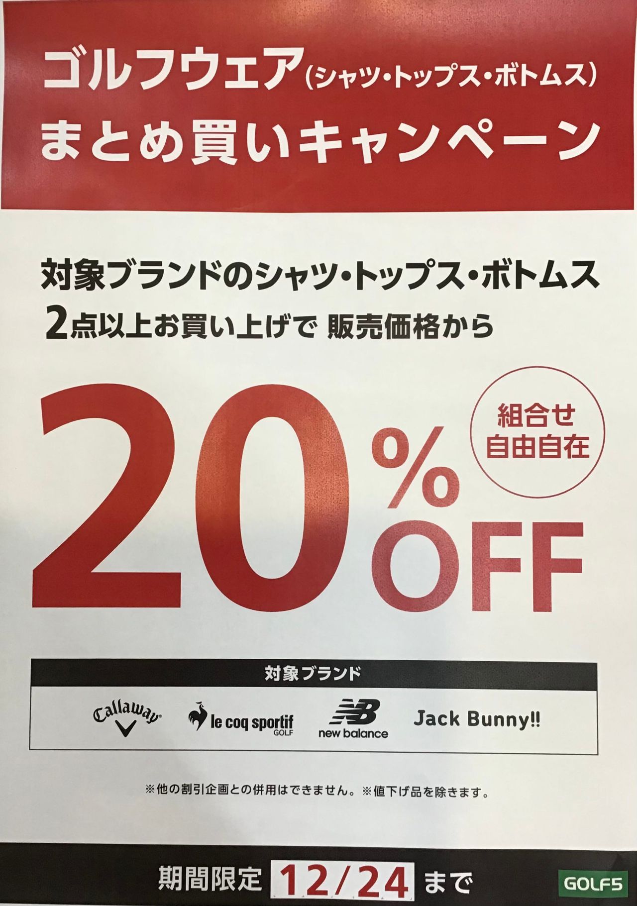 キャロウェイ・ルコック・ニューバランス・ジャックバニー製品のシャツ・トップス・ボトムスを、2点以上お買い上げで20%OFFとなります!!!