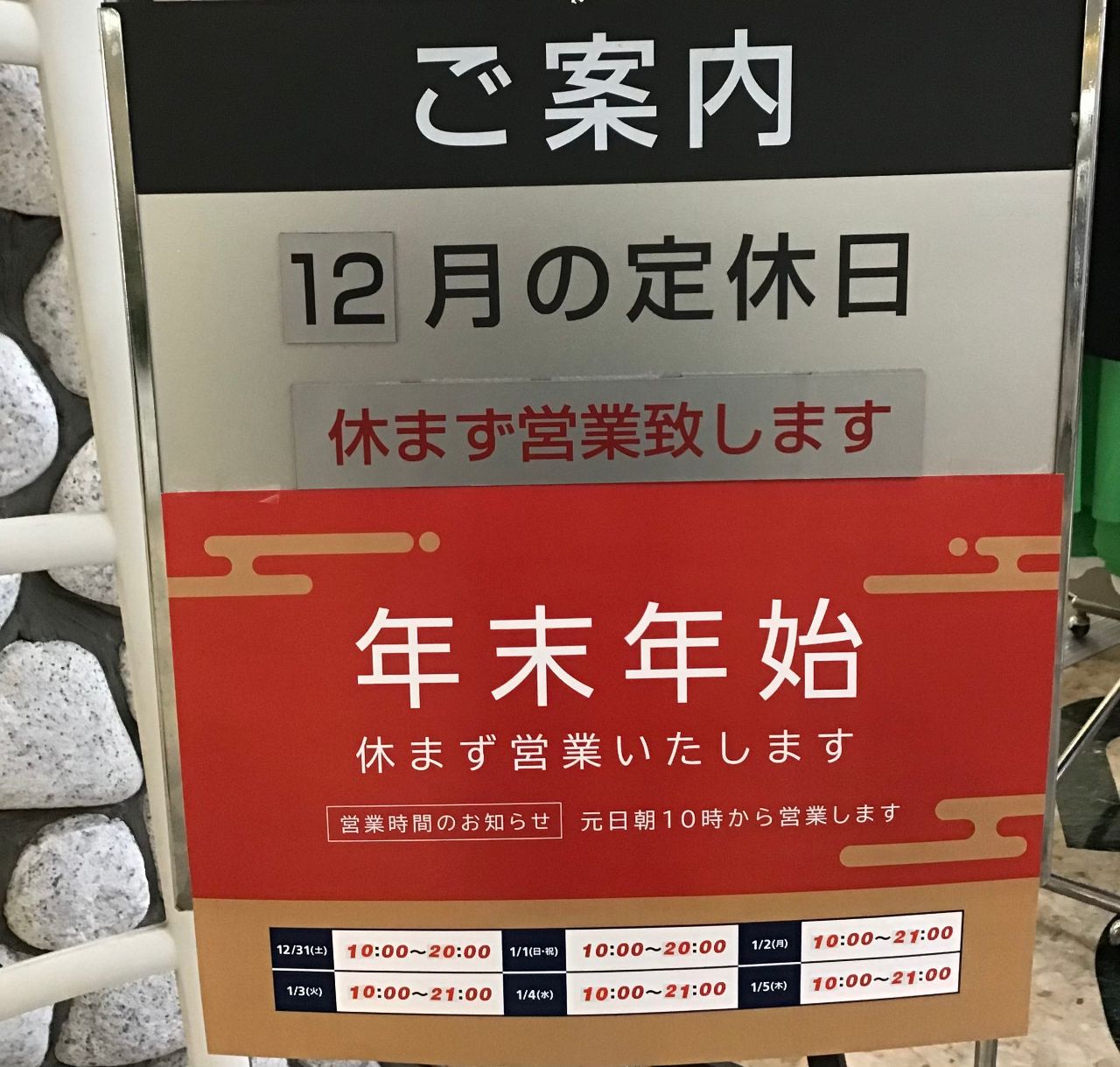 12月31日と1月1日は時短営業となりますので