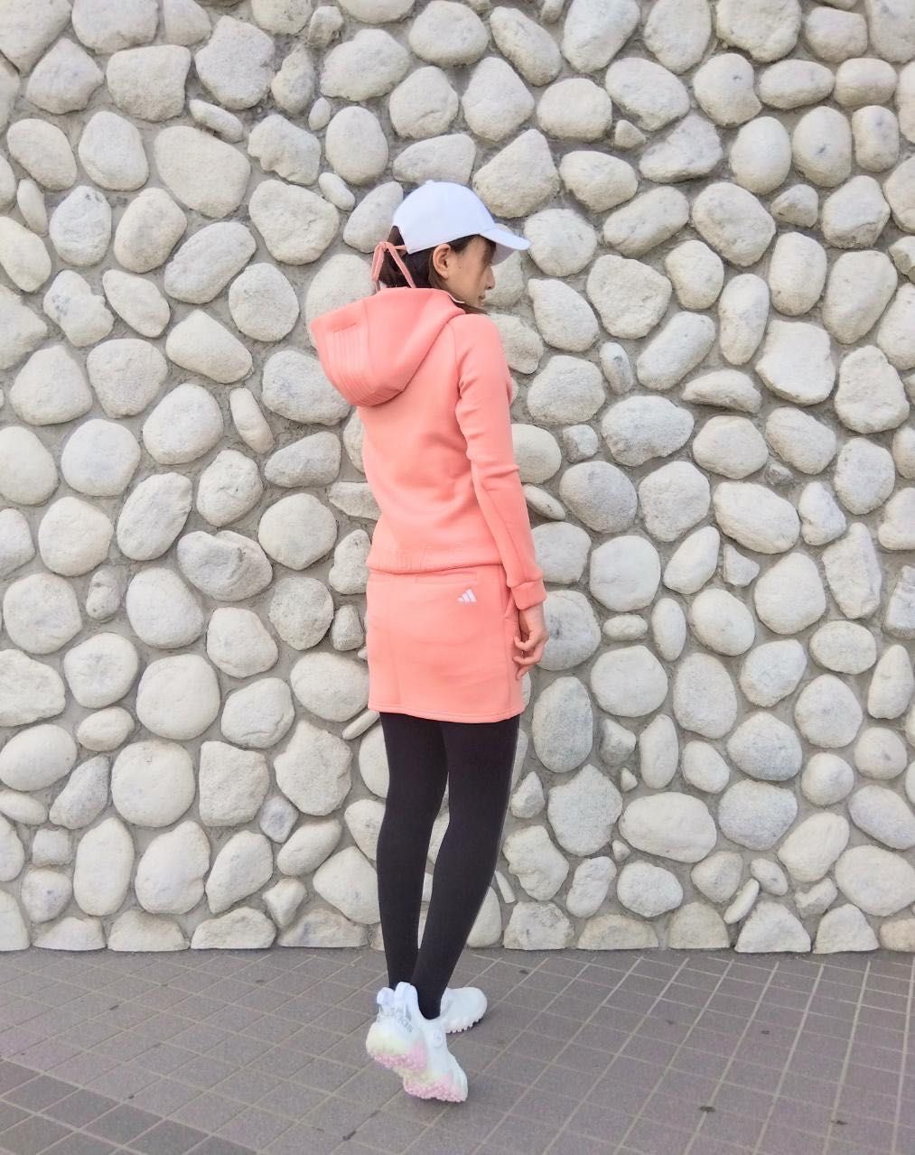 【上着】コーラル M ¥13200、【スカート】 コーラル M ¥11000 【キャップ】ペールピンク ¥4400