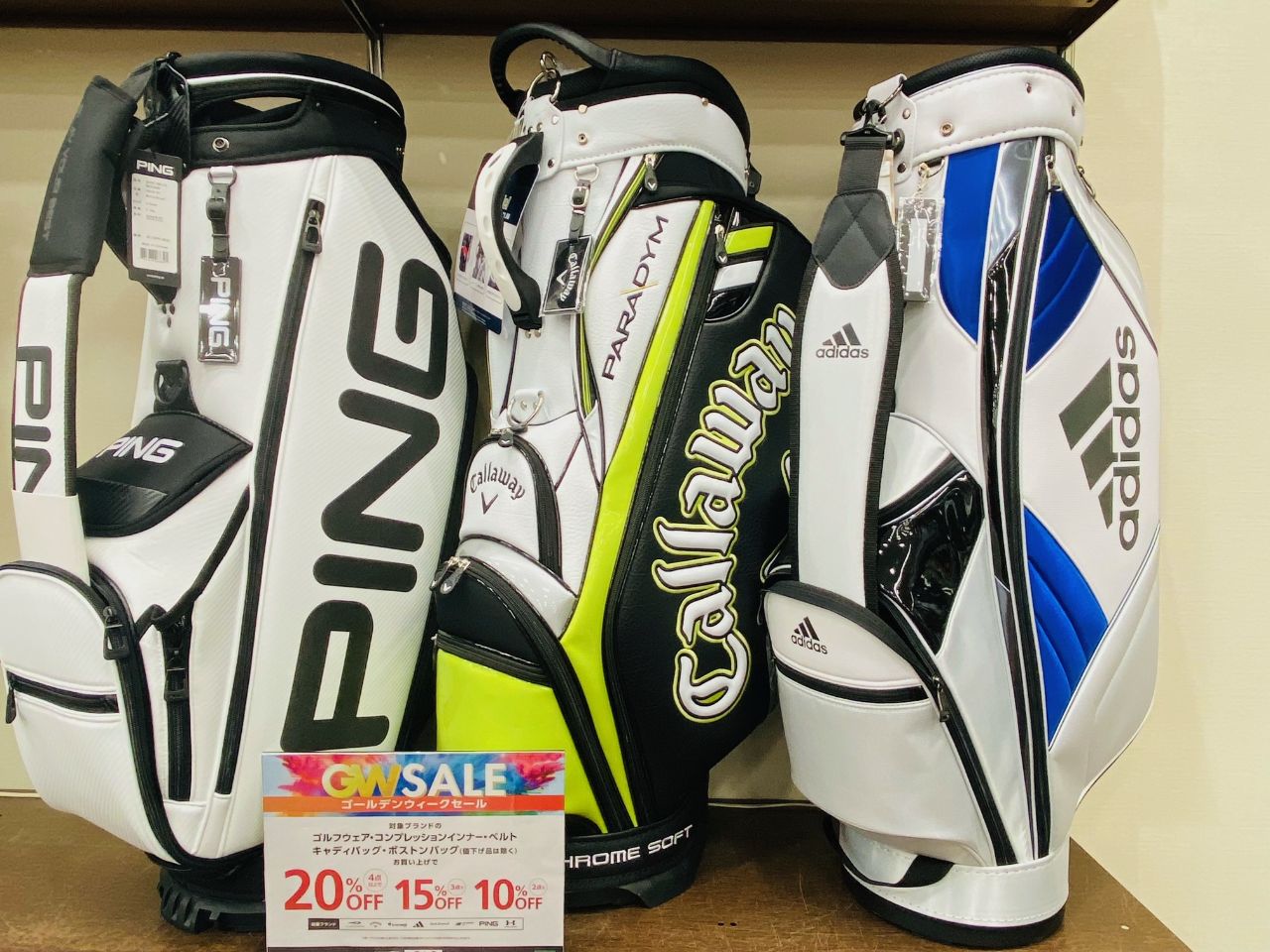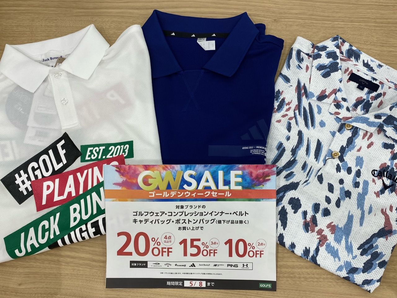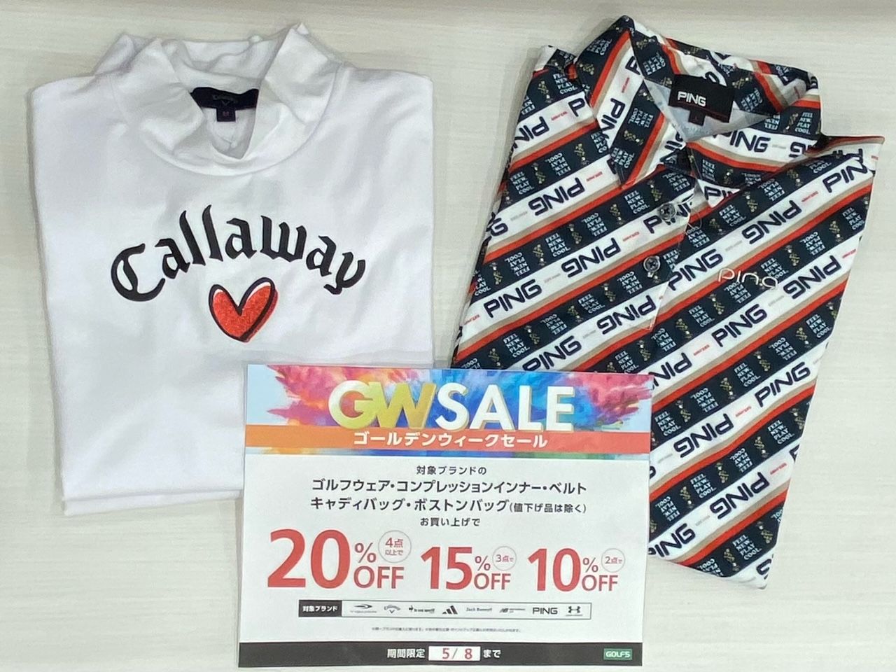 対象ブランドは、ティゴラ、キャロウェイ、ルコック、アディダス、ジャックバニー、ニューバランス、ピン、アンダーアーマーで、値下げ品は対象外となります。