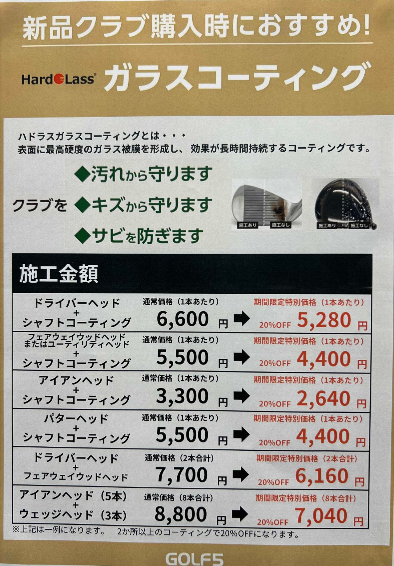 このお得なキャンペーンは期間限定となっております。この機会に、大切なクラブを長持ちさせるために、コーティング加工をぜひご利用ください!