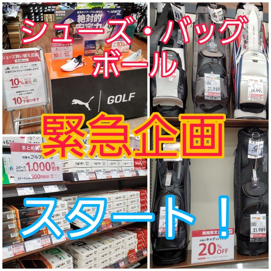 8月18日(月)迄の期間限定にて、「ゴルフシューズ・キャディバッグ・ゴルフボール」をお値打ちにお買い求めいただける「緊急企画」がスタートしました♪