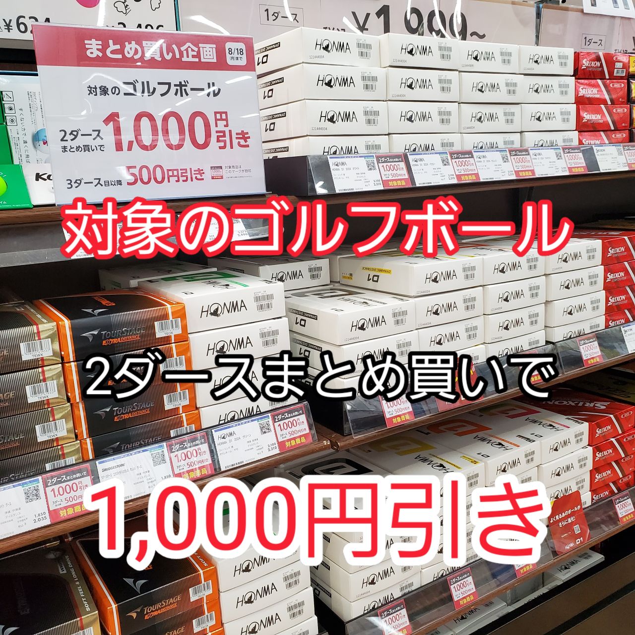 税込3,000円以下のゴルフボールを2ダースお買い上げで、レジにてさらに「1,000円」引きとなります♬(3ダース以降はさらに500円引き)