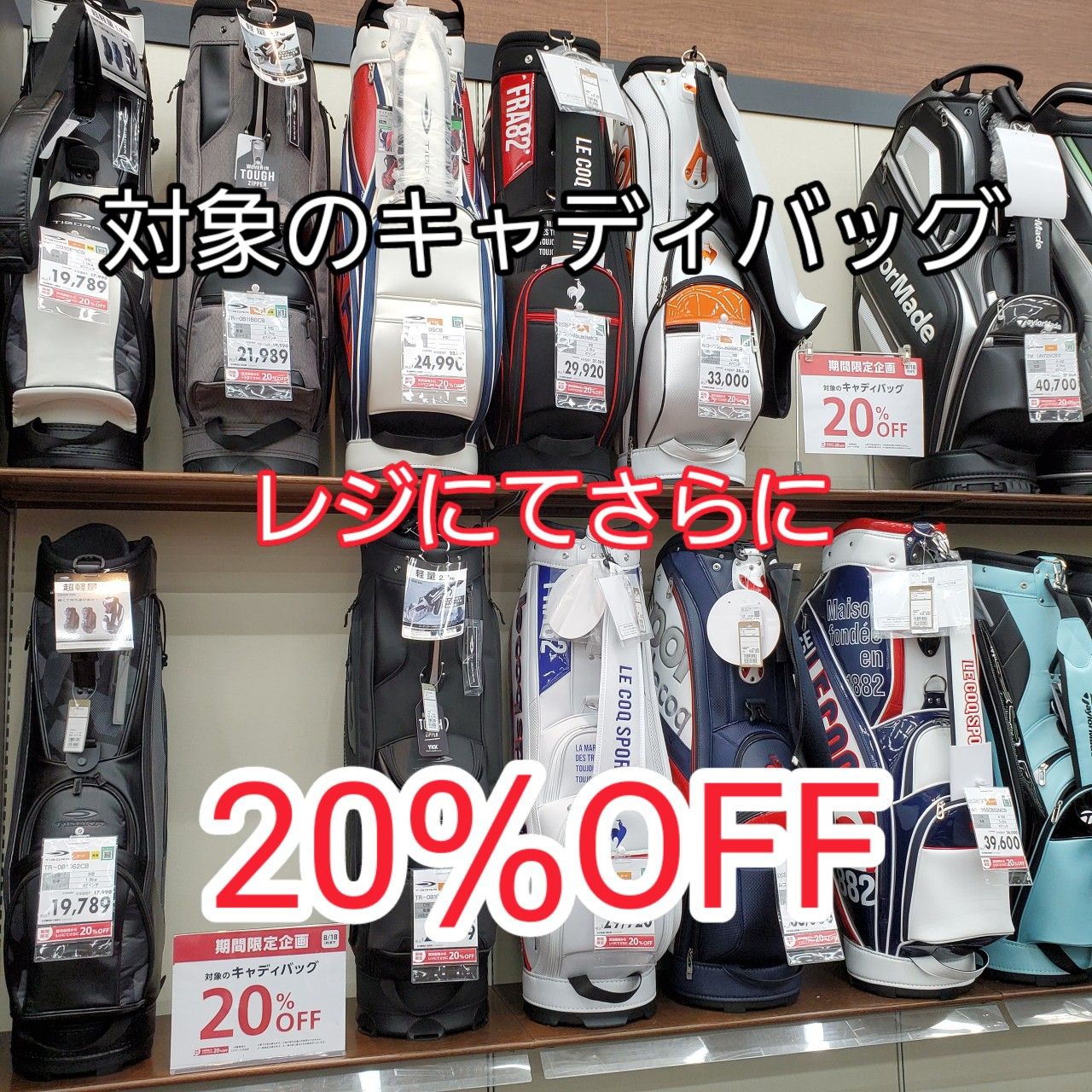 「ティゴラ」「キャロウェイ」「テーラーメイド」「タイトリスト」「ブリジストン」「ニューバランス」の対象キャディバッグをお買い上げで、レジにてさらに「20%OFF」となります♪
