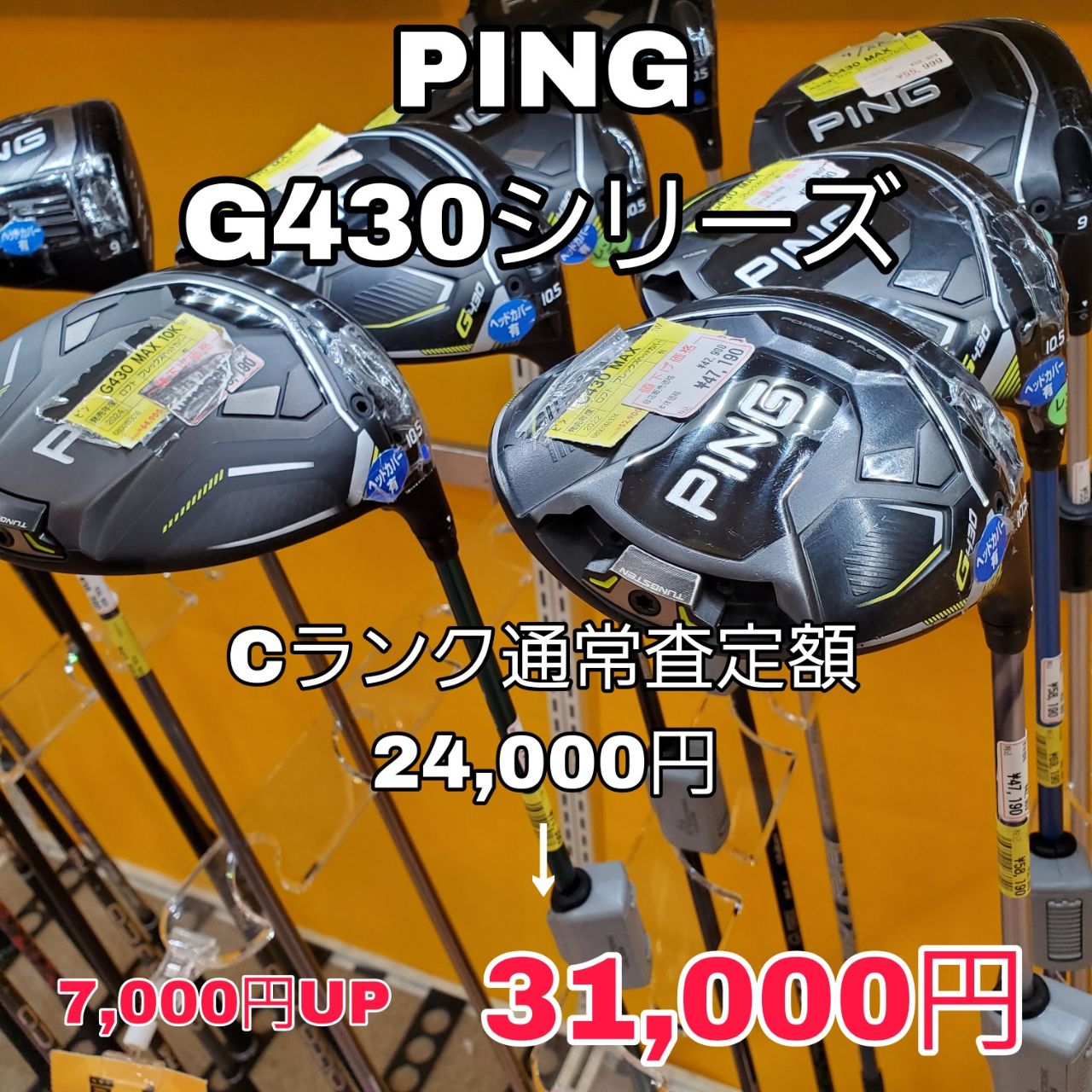 いずれのクラブも、通常査定額(Cランク)より「3,000円~12,000円」アップにて定額買取致します!カスタムシャフトはさらに買取額がアップしますので、詳細は店頭にてお確かめください☆