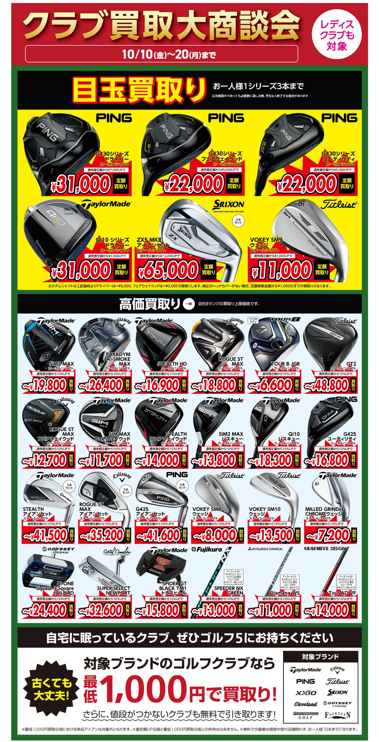 また、全クラブ通常査定額から「10%UP」、対象ブランドの全クラブを最低「1,000円」で買取の特別企画も実施中ですので、この機会にキャディバッグごとご持参ください(^^♪