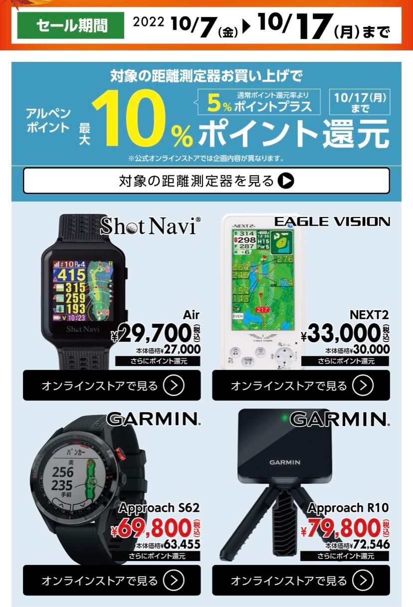 そしてガーミン アプローチ S62,S42は10月限定で価格が安く手に入る大チャンス!悩まれてたら今しかない!