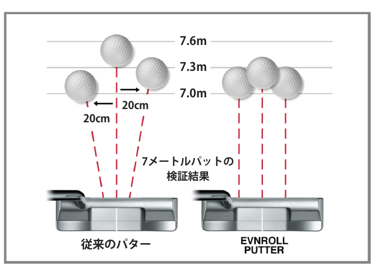 イーブンロールパター最大の特徴である画期的なフェイス面「スイートフェイステクノロジー」は、オフセンターヒット時も距離のロスがほとんどなく、ボールがライン通りに転がります♪