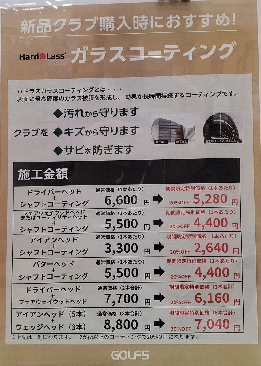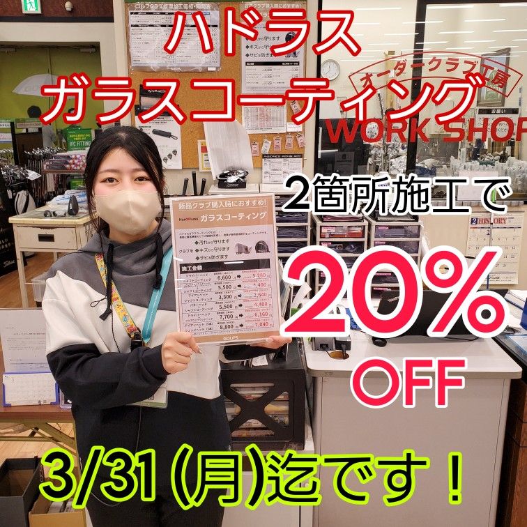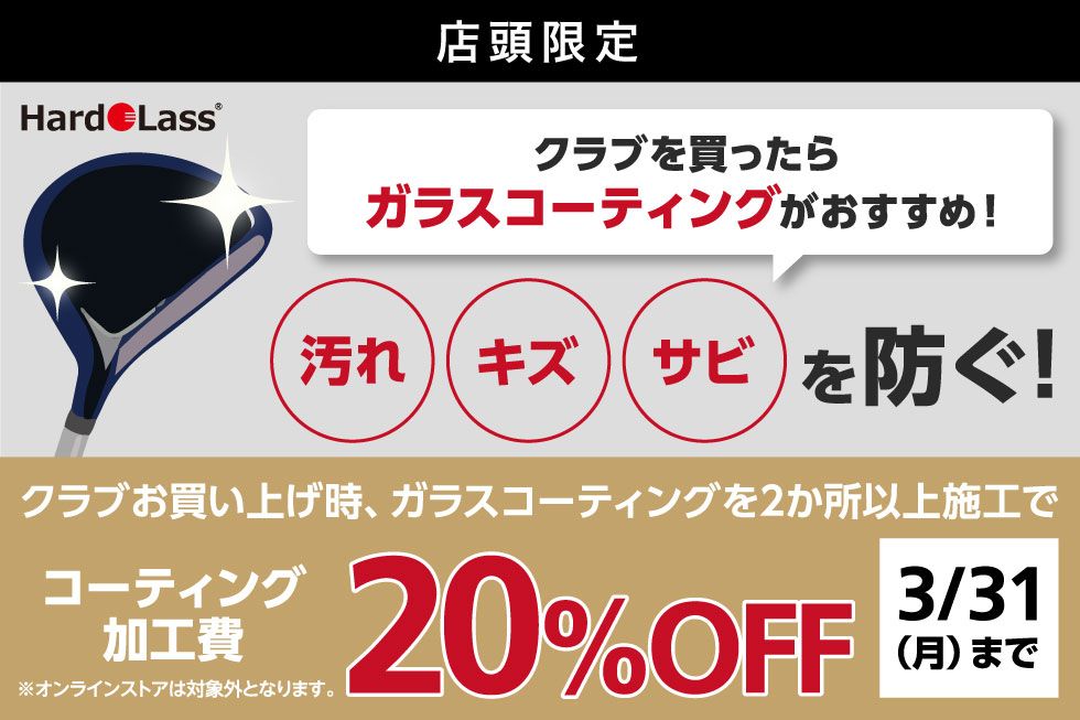 当店では3/31(月)迄の期間限定にて、クラブご購入時にガラスコーティングを2箇所以上施工頂きますと合計金額より「20%OFF」となるキャンペーンを実施中です(^^♪