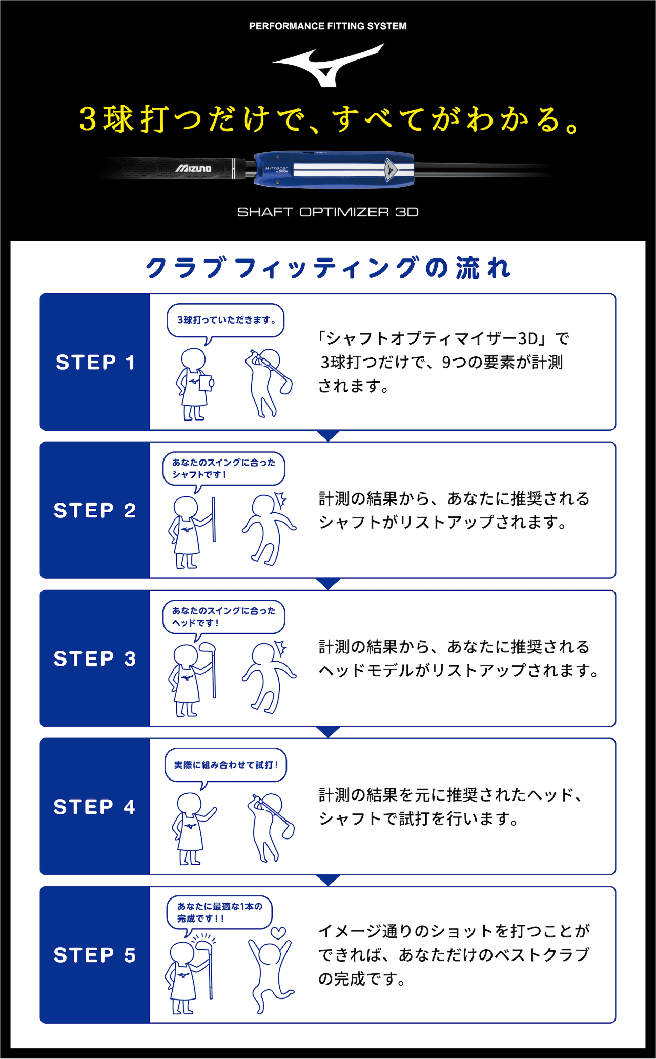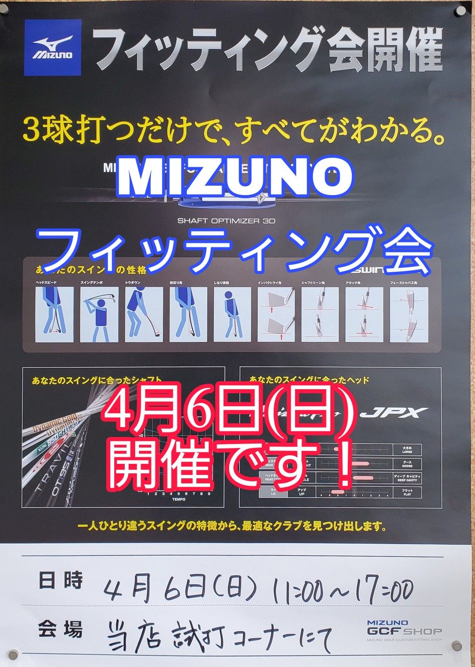 イベント当日は、ミズノ独自の計測器「シャフトオプティマイザー 3D」で3球打つだけで、お客様に推奨の「シャフト」「ヘッド」をご提案致します♫