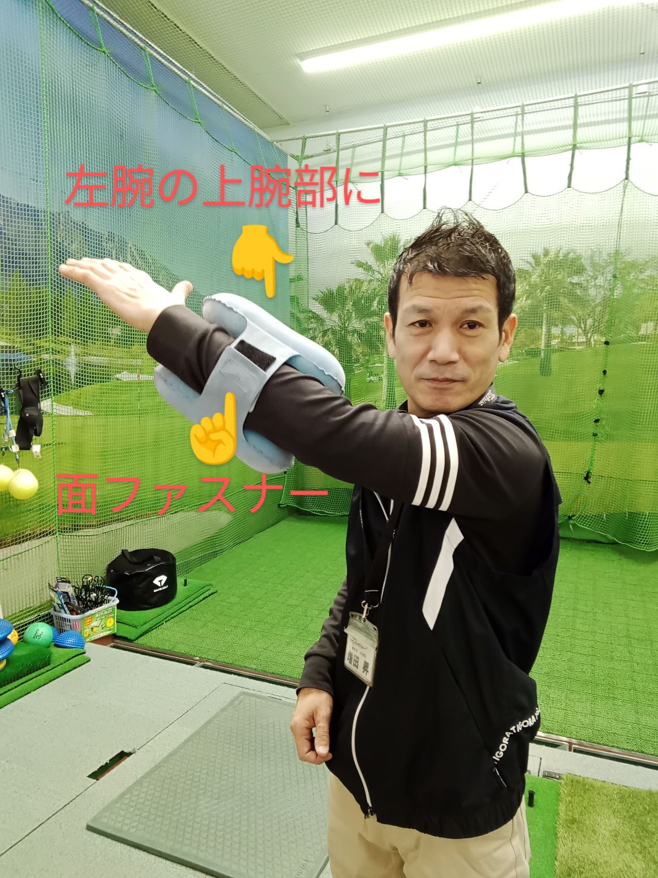 製品の面ファスナーで、左腕の前腕部に製品が落ちないように
