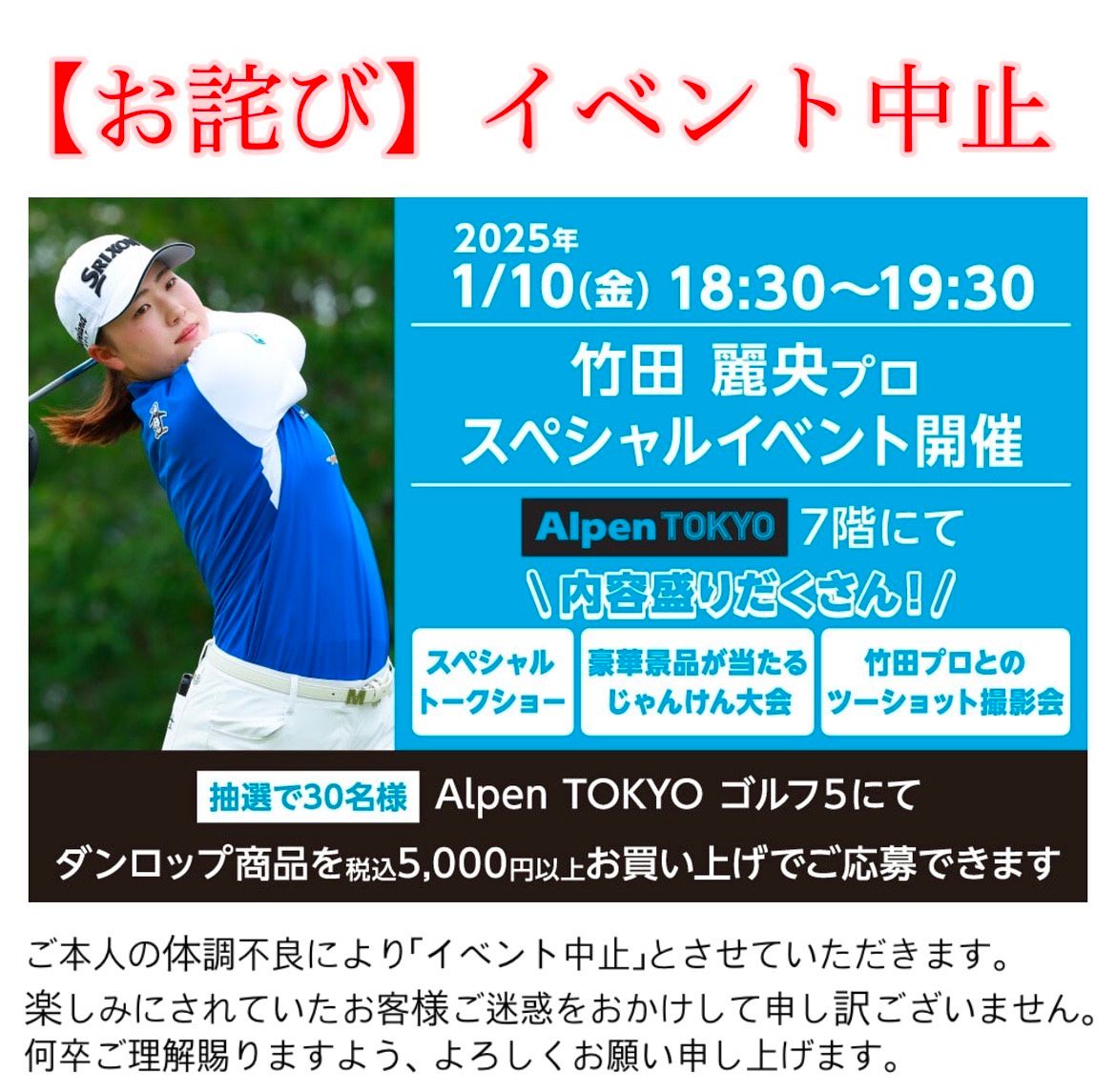 【お詫び】1/10(金)開催「竹田麗央プロ スペシャルイベント」中止のお知らせ