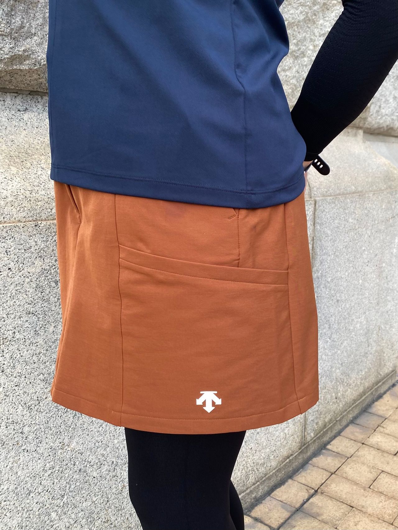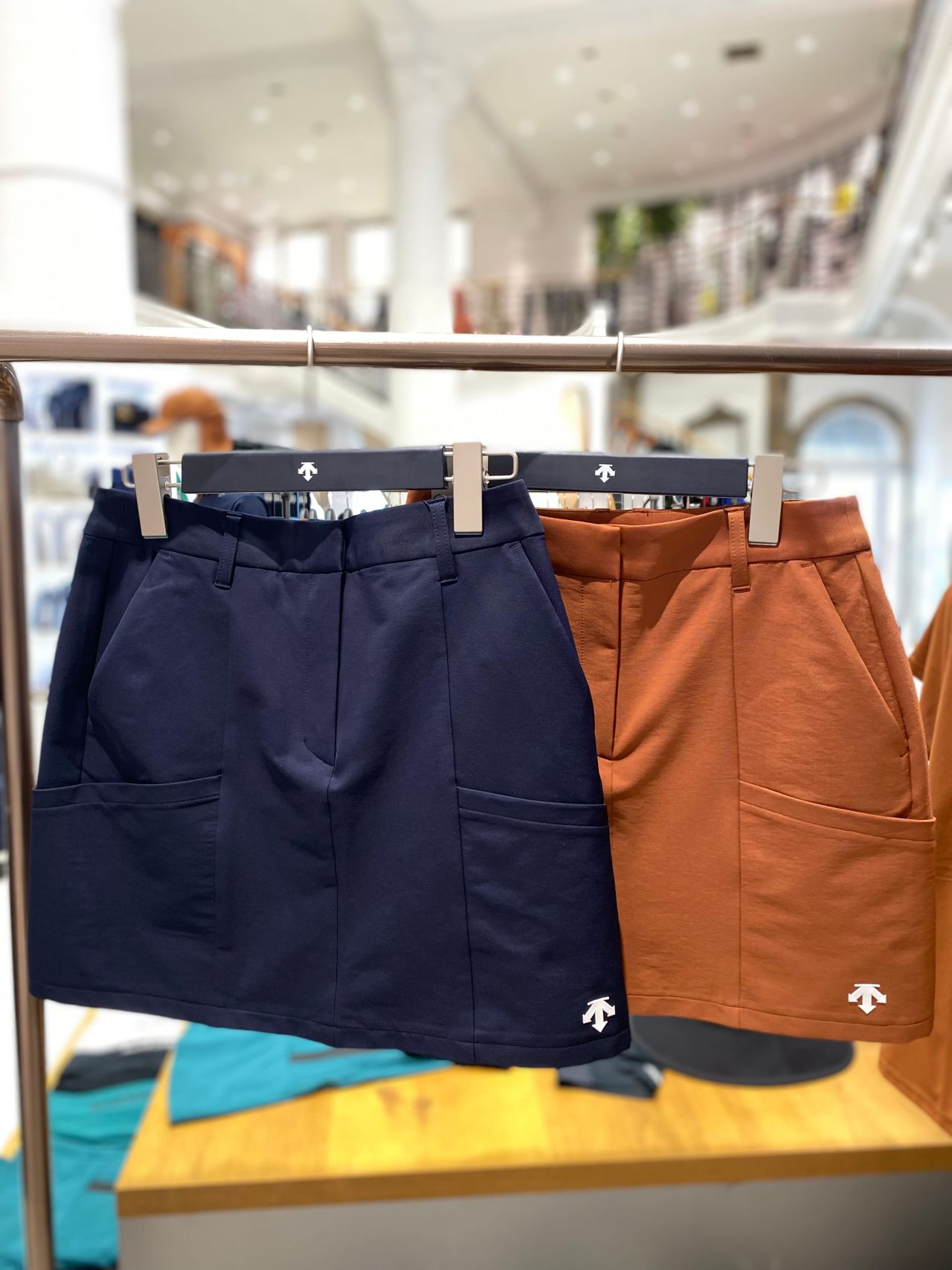 スポーティーかつトレンドライクなシルエットのスカート(スタッフ着用)は、パンツ型のインナーがドッキングされているので、ゴルフスイングなどのダイナミックな動きも◎