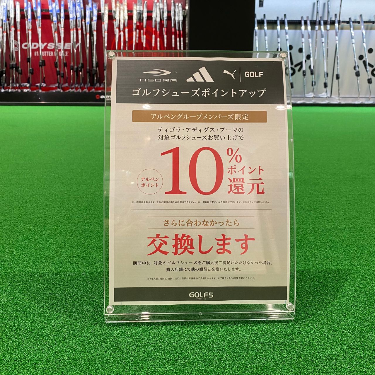 期間中に、対象のゴルフシューズをご購入後ご満足いただけなかった場合、購入店舗にて他の商品と交換いたします。