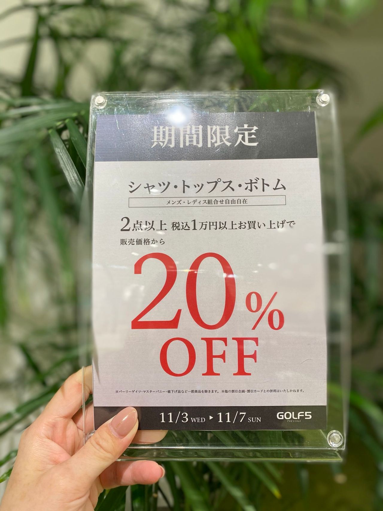 11/3(水)〜11/7(土)まで、シャツ、トップス、ボトム(メンズ、レディース組み合わせ自由✨)2点以上、税込1万円以上お買い上げで、販売価格から20%OFFとなります‼️‼️