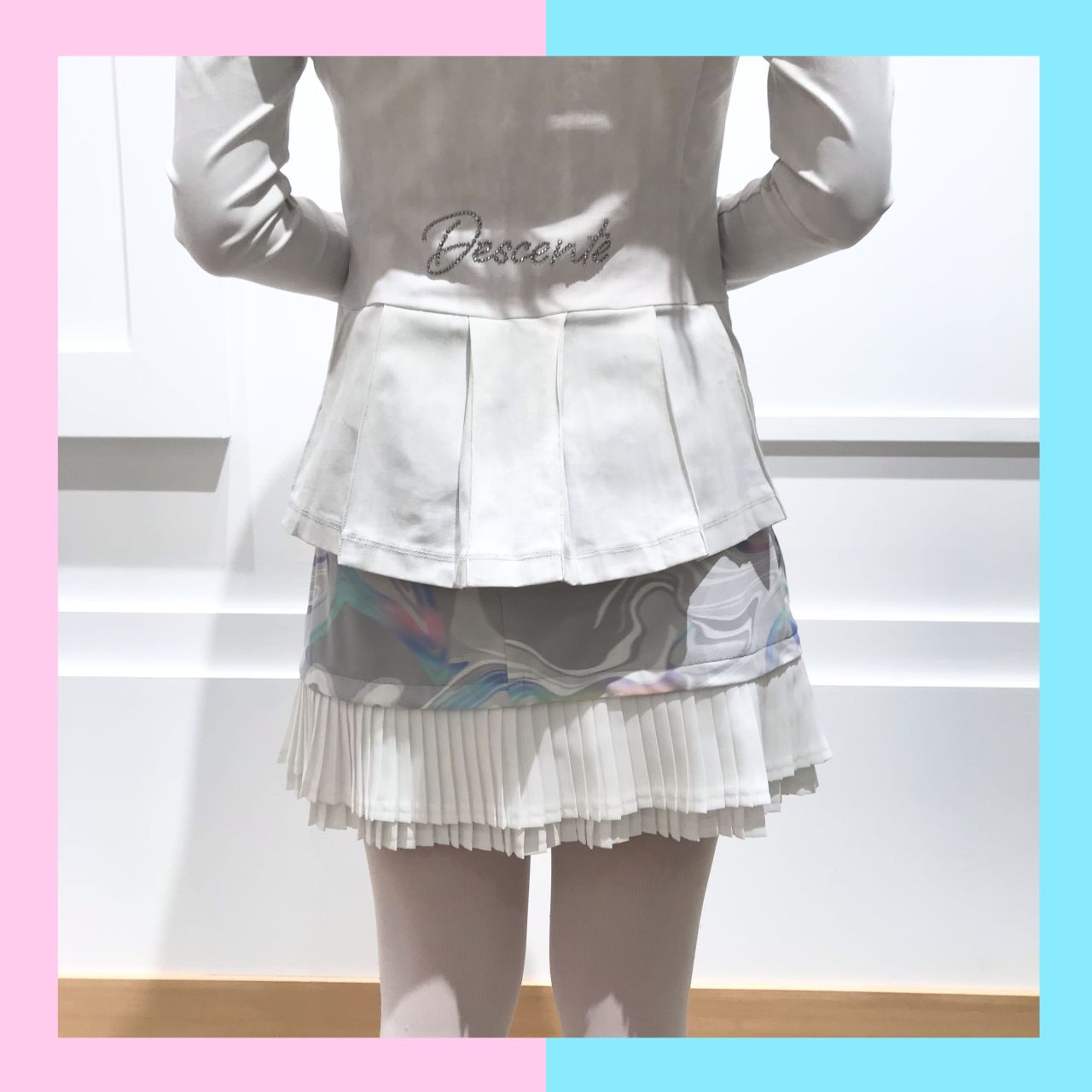 バックデザインがdescenteのロゴにスワロフスキーで施されておりプリーツが入ったデザインです!