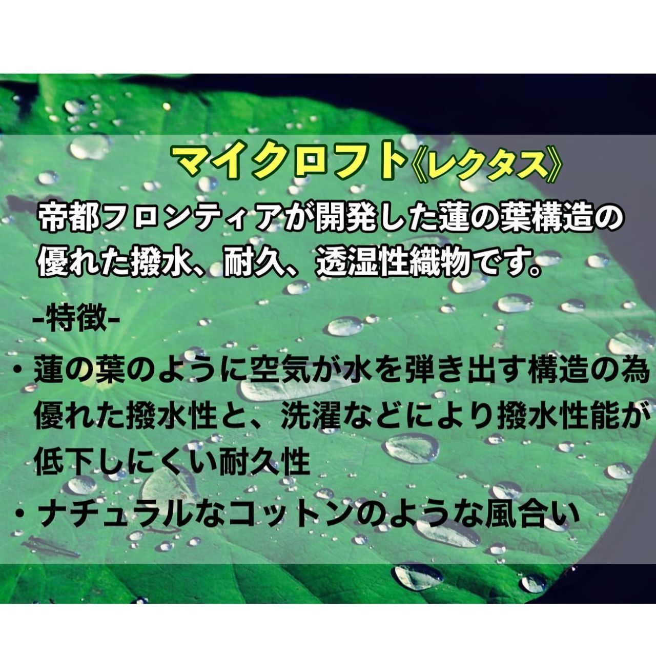 "蓮の葉構造"により表面の水滴を流し落とす機能が衣服内に水分の侵入を防ぎ、