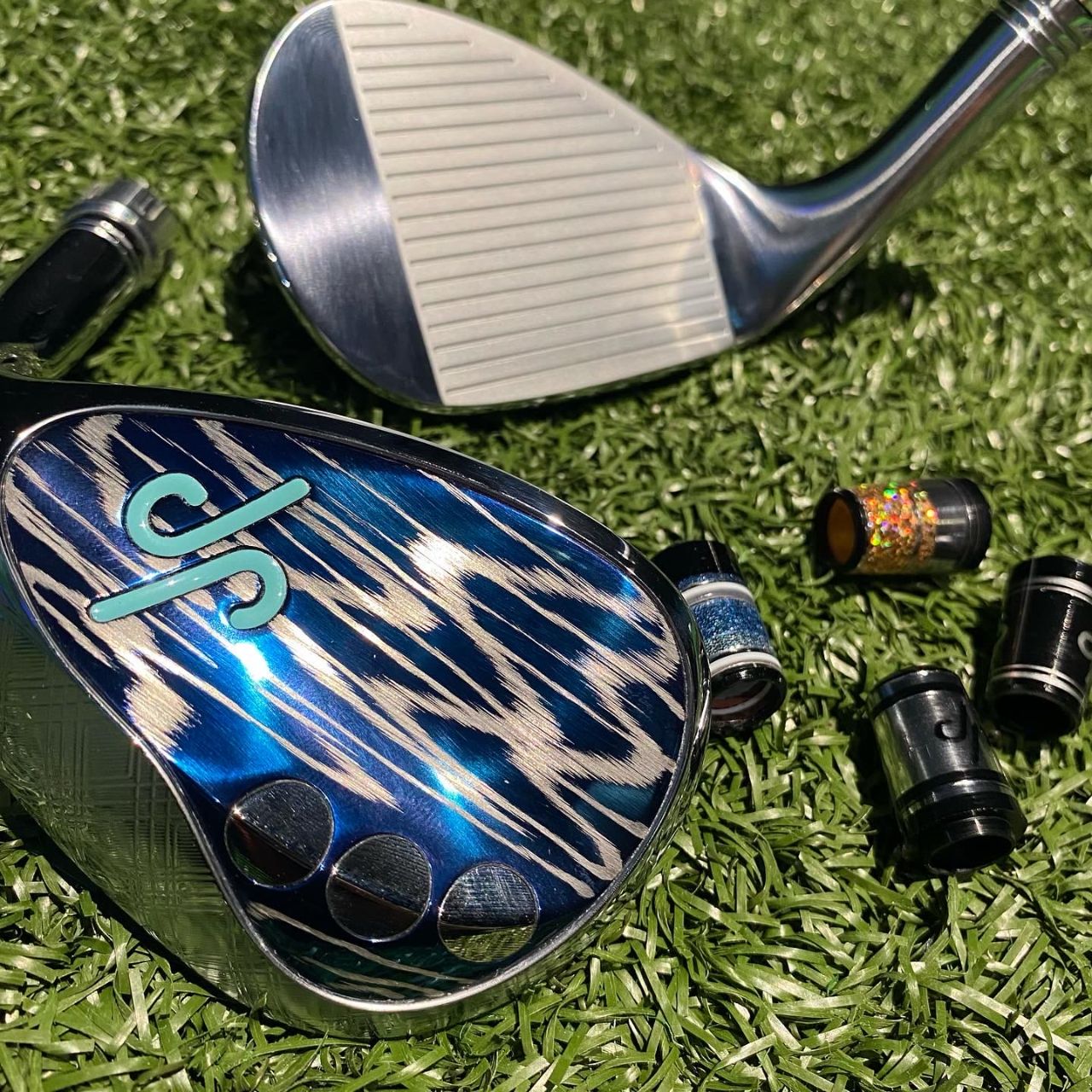 バックフェイスに波形の模様が施されたスクレイプモデルのブラックとブルーのサンプルヘッド、