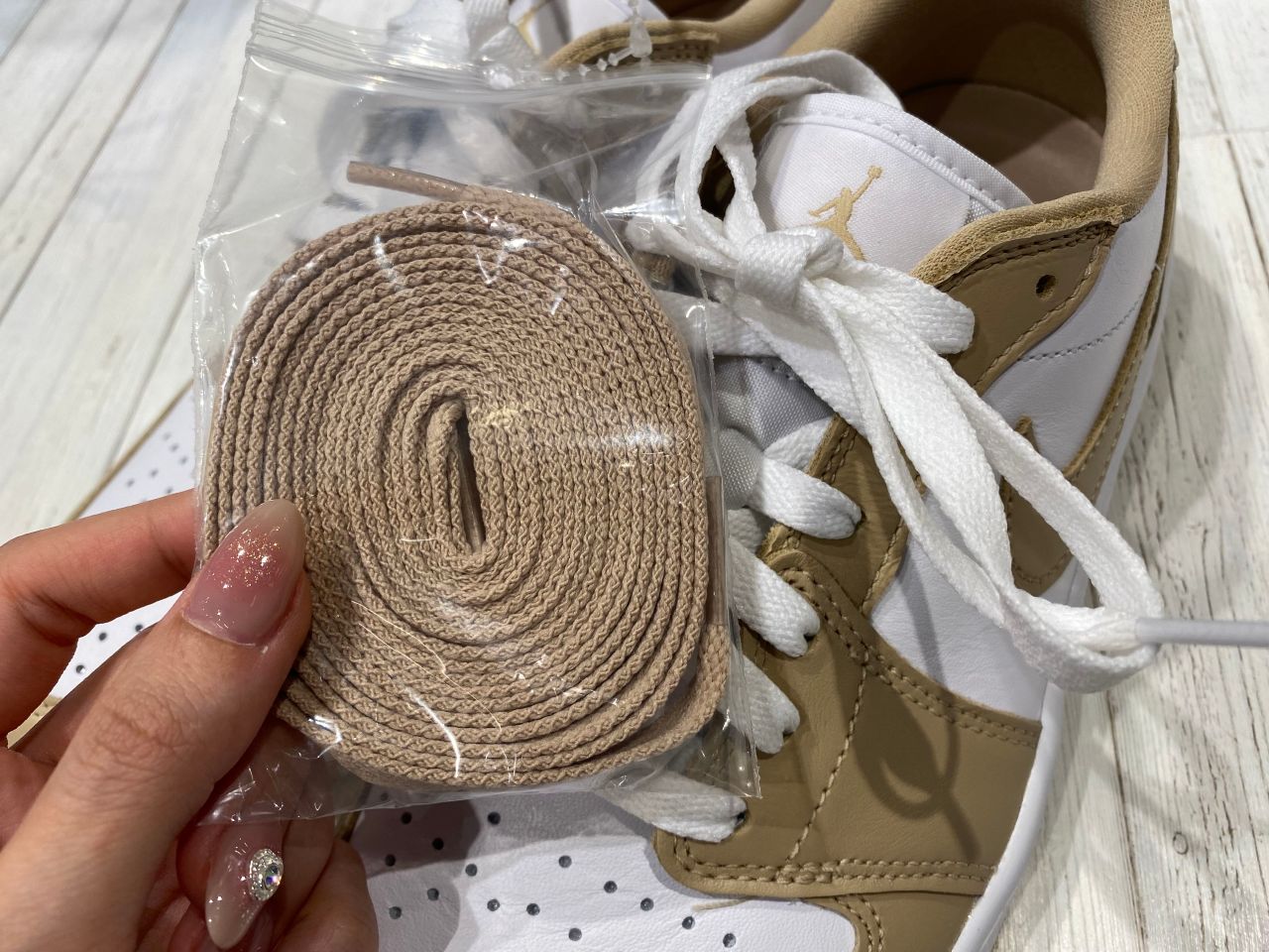 ホワイトとベージュの組み合わせが可愛いカラーとなっております⭐️靴紐のカラーチェンジも可能✨