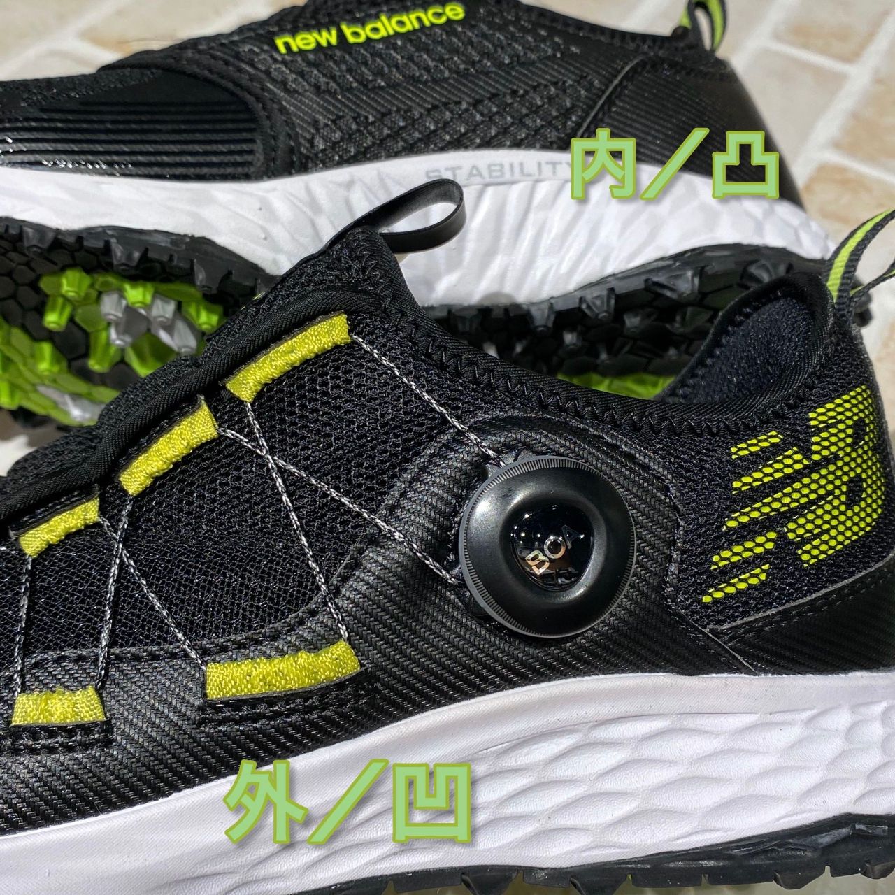 ミッドソールの内側を凸にして、さらに縦方向に配置することで、潰れにくく内側への倒れ込みを防ぎ安定性向上。